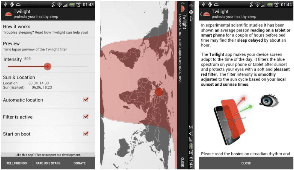 Twilight(薄暮微光)是一款专业护眼应用,通过在手机屏幕上添加柔和滤镜,降低蓝光辐射,缓解眼睛疲劳,改善睡眠质量。该应用支持自定义色温、亮度和滤镜强度,并可根据时间自动调节,适合长时间使用手机的用户,尤其在夜间阅读或低光环境下。