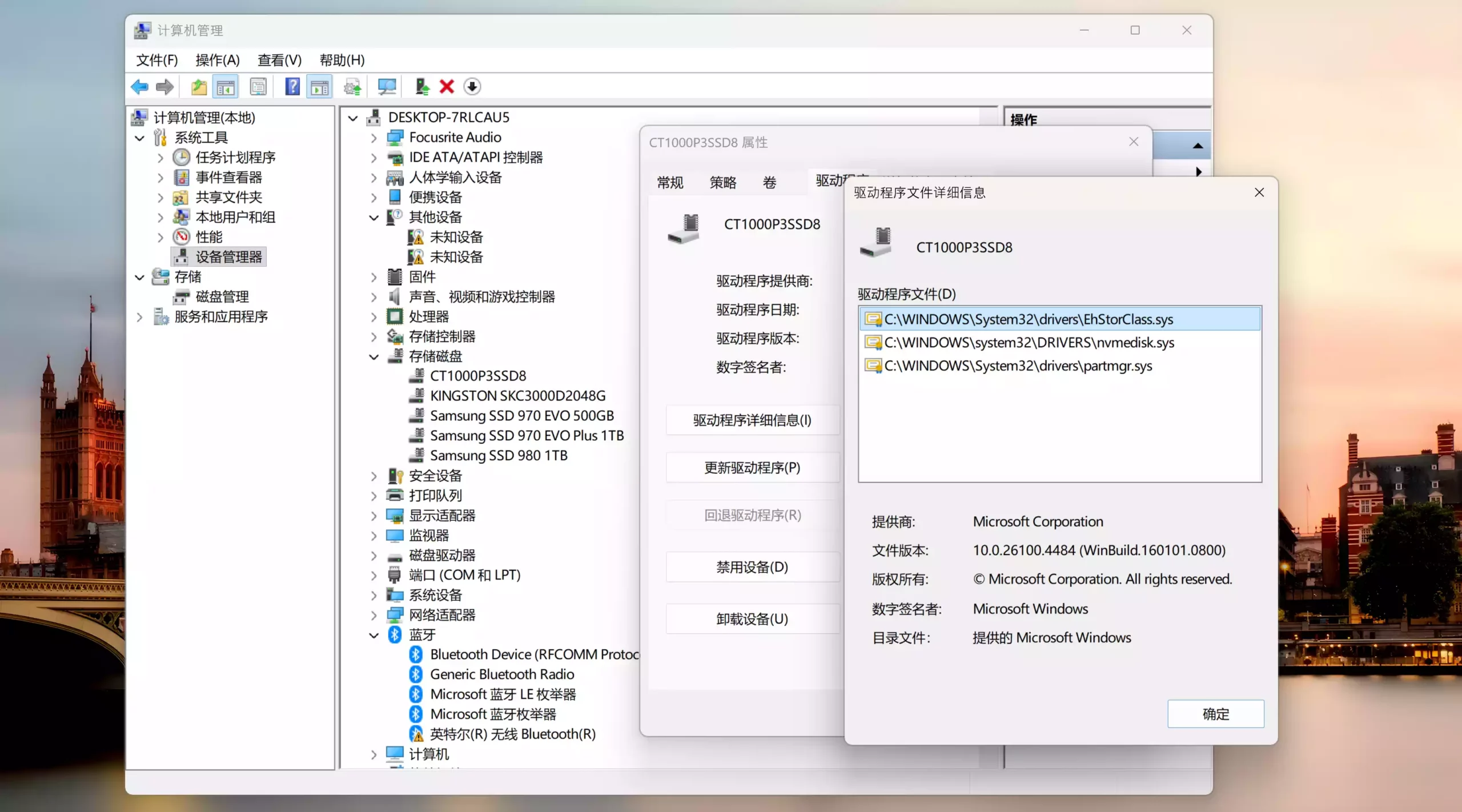 在设备管理器中右键 SSD,进入属性 → 驱动程序 → 驱动程序详细信息。