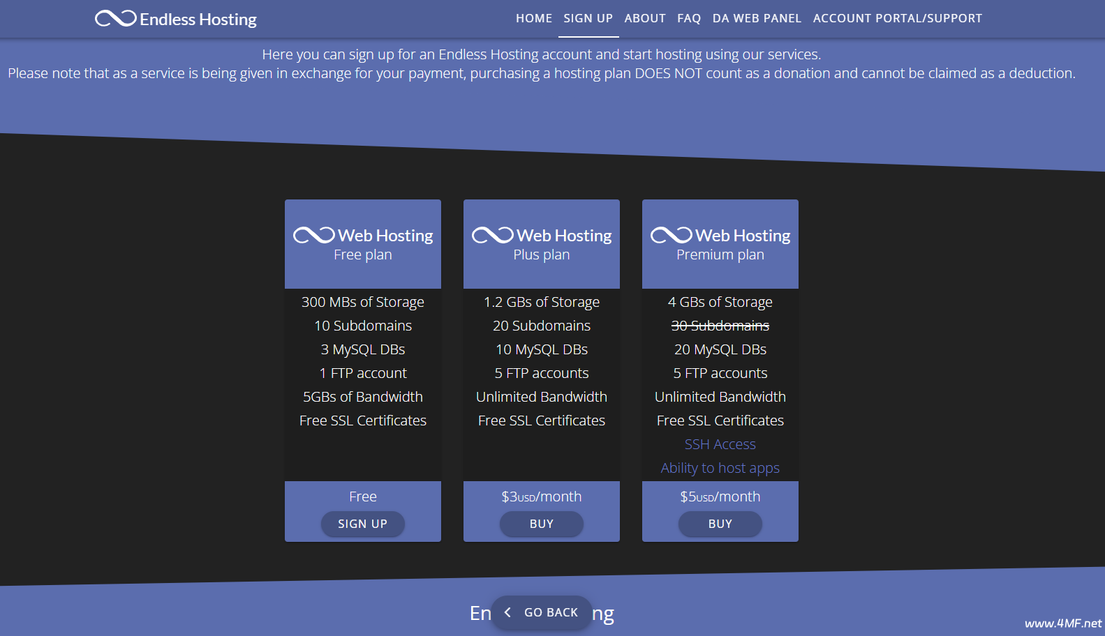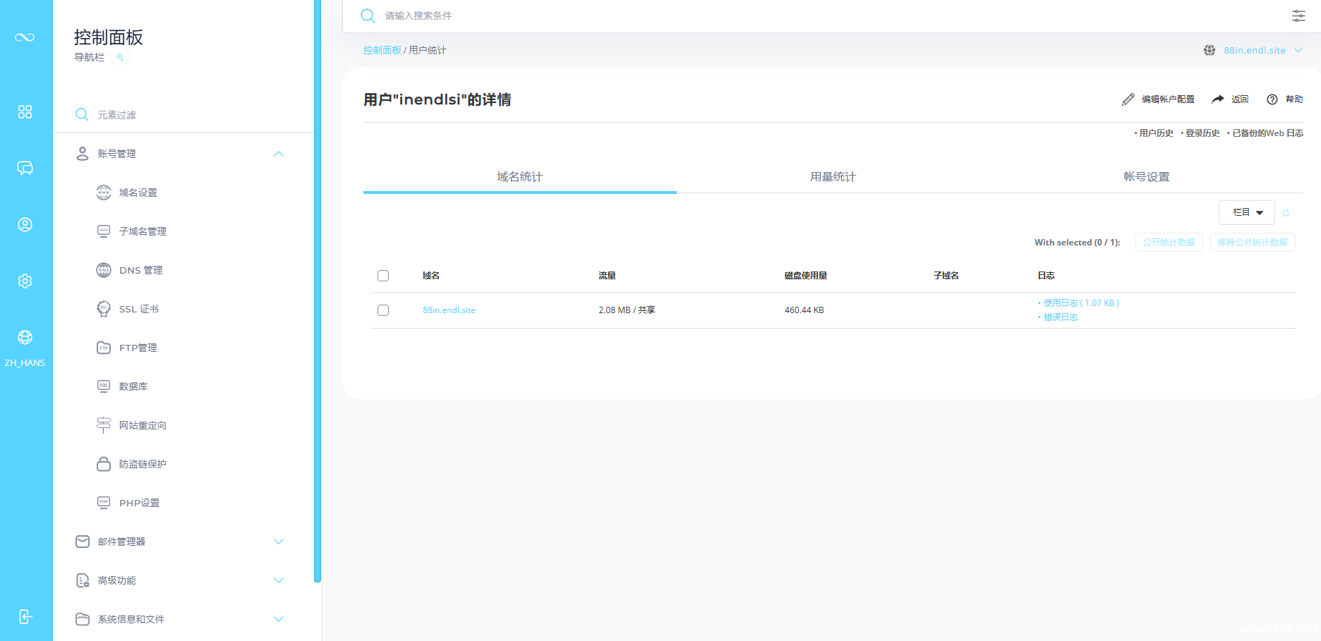 Theendlessweb免费的共享虚拟主机,由Endless Group提供支持。免费版主机300M空间,5gb流量,DirectAdmin管理面板,支持PHP、MySQL、ftp、文件在线管理等,功能一应俱全。可以绑定域名,一个主机可以创建5个站点。