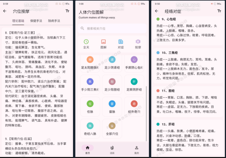 | 精准穴位图解 | 精确定位人体穴位并提供详细解析,覆盖肺、肠、脾、胃等多部位穴位,直观了解穴位位置与作用 |