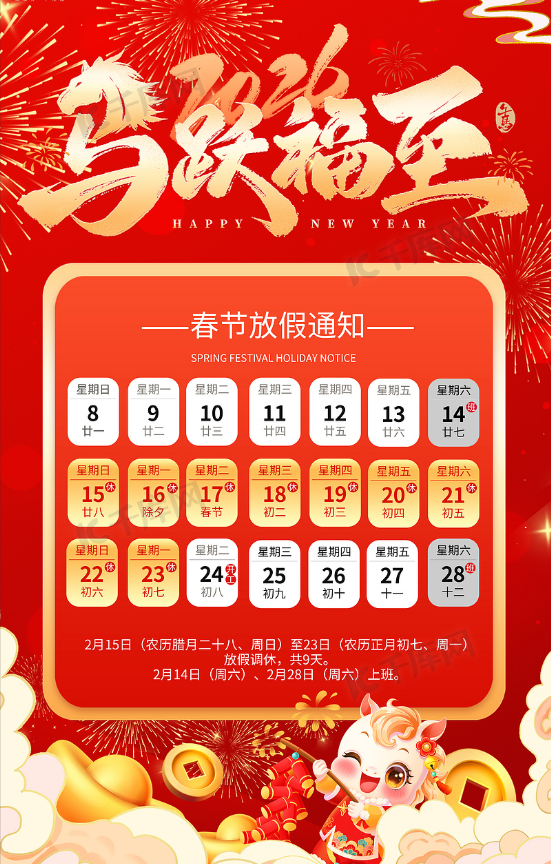 根据国务院办公厅,此前公布的2026年放假安排2026年春节假期从2月15日(农历腊月二十八、周日)持续至23日(农历正月初七、周一),放假调休共计9天。