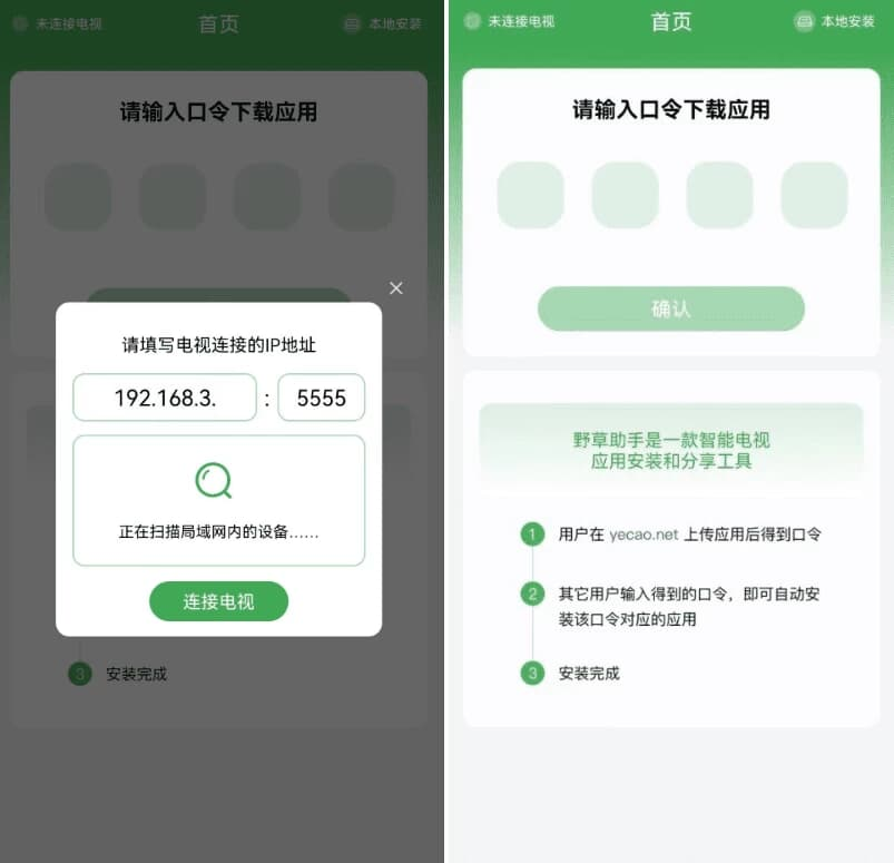 野草助手,电视端应用安装工具,电视盒子装软件,智能电视安装神器,口令安装,远程安装电视应用,U 盘装电视软件,电视应用批量安装