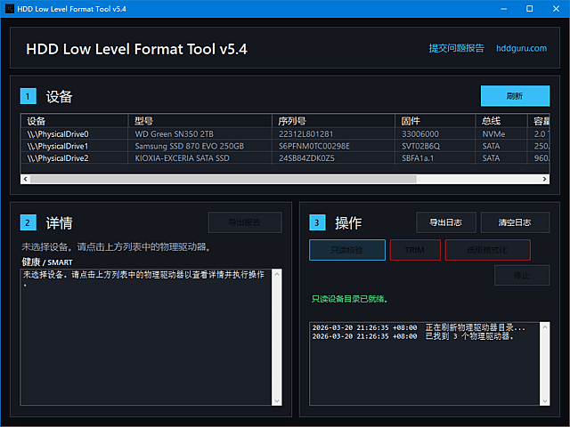 HDD Low Level Format Tool 是专业硬盘低级格式化工具,可对硬盘进行扇区级彻底擦除与初始化,解决无法格式化、坏道、分区损坏、病毒残留等问题。