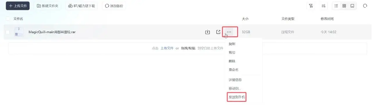 找到刚刚保存的文件夹。 - 点击右上角三个点,选择「发送到手机」