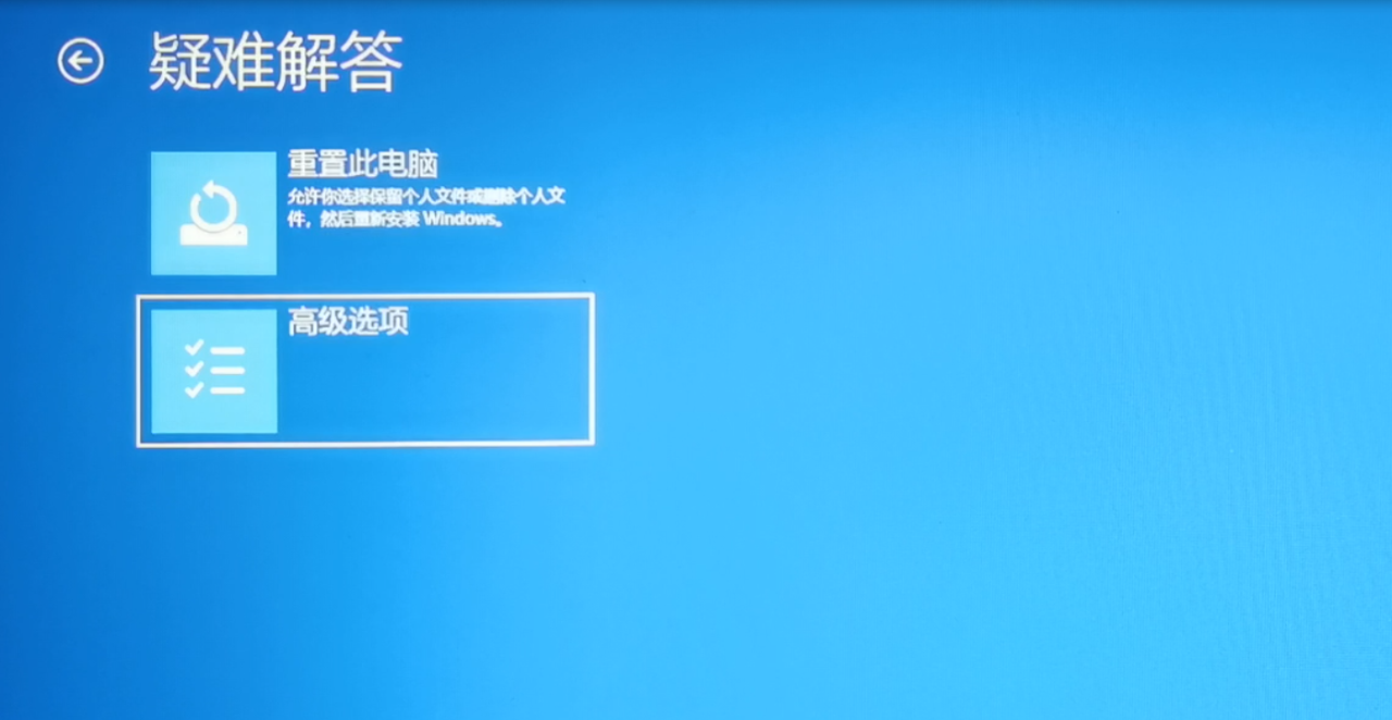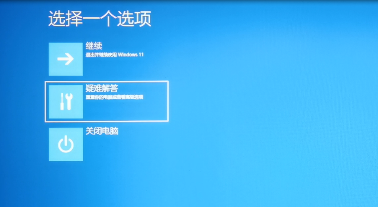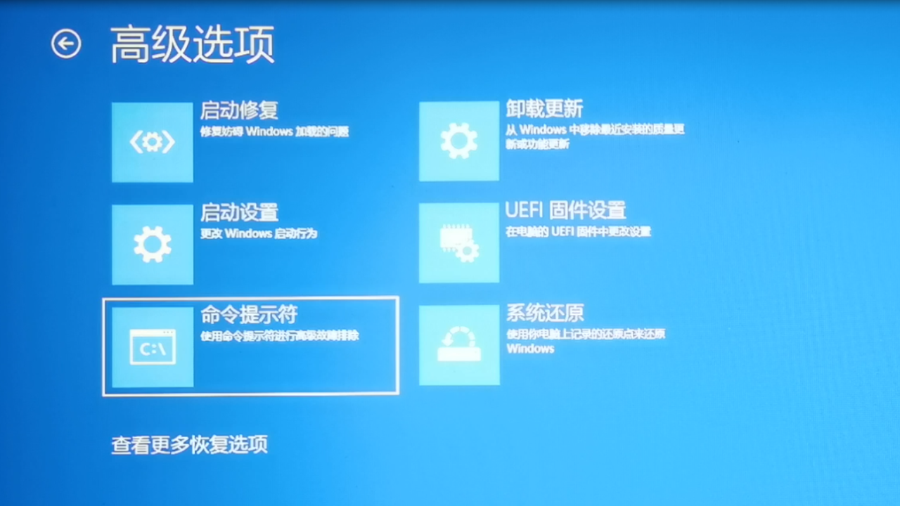 当进入到这个界面之后,松开shift键,选择疑难解答,接着选择高级选项,选择命令提示符选项。