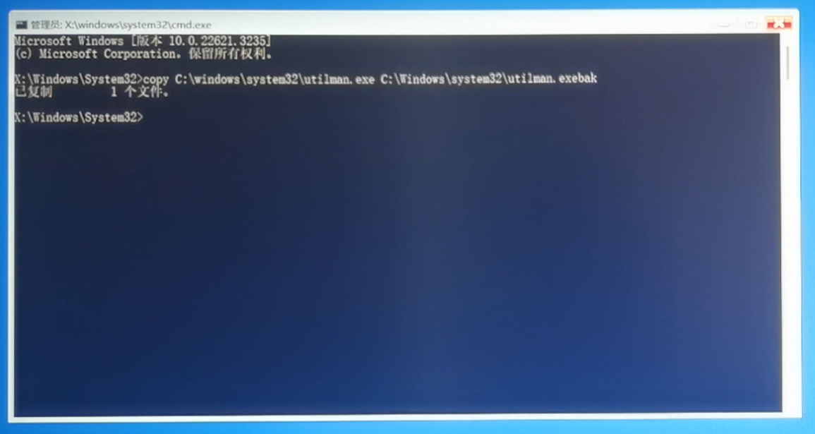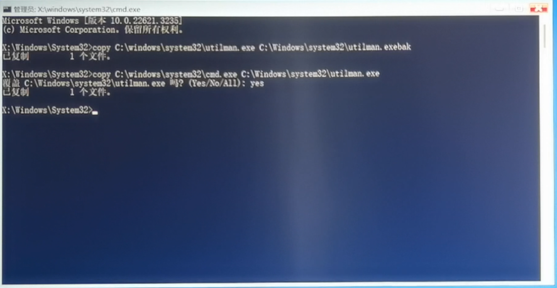 打开之后就会出现终端命令行输入界面了,现在跟着我来输入以下命令:copy C:\windows\system32\utilman.exe C:\Windows\system32\utilman.exebak 回车,回车之后会显示已复制,接着输入第二个命令:copy C:windows\system32\cmd.exe C:\Windows\system32\utilman.exe回车,回车后会让你选择是否覆盖,这里输入yes 回车,然后会显示已复制。