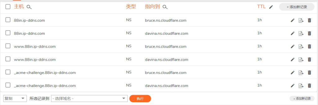 注意:Cloudns域名和普通的托管有些区别,除了更改NS为Cloudflare的服务器以外,如果想要其他三级前缀的域名,比如www.88in.ip-ddns.com添加,也需要添加对应的两条NS记录。